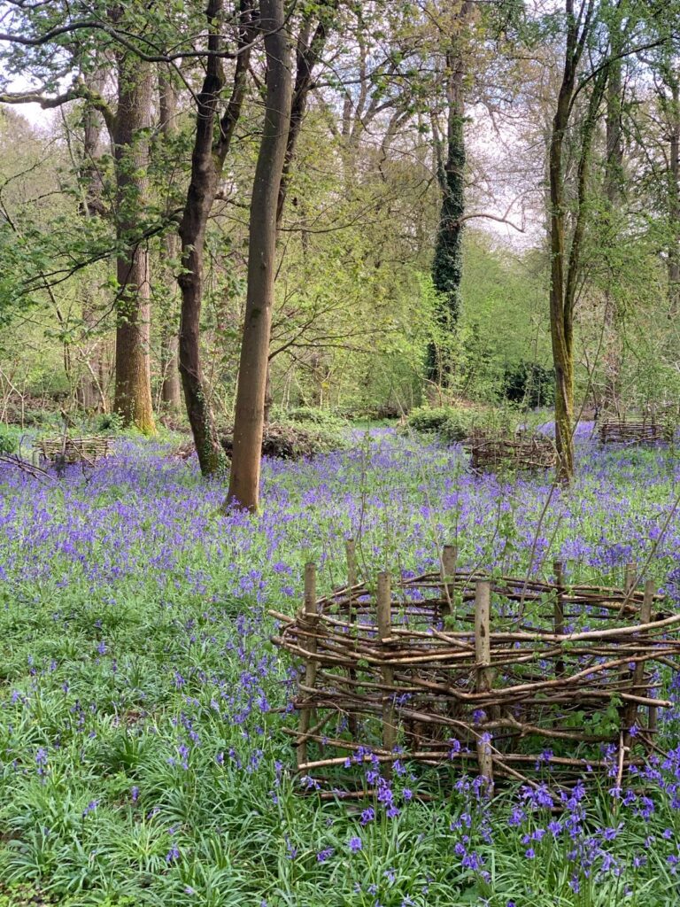 The weather might not feel too spring-like, with April showers eclipsed by persistent rain. However, the hardy bluebells have come out and the wood looks fabulous. Our winter work weaving baskets around coppiced trees looks good too.